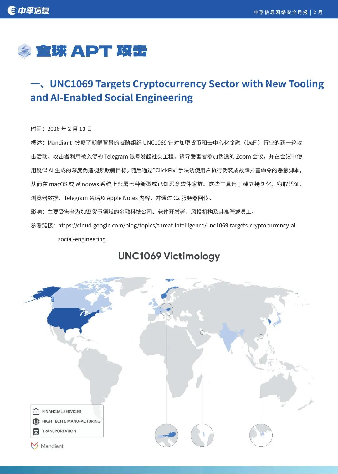 其中,地缘政治冲突仍是APT组织的首要攻击背景,与之相关的攻击活动非常活跃,分别有:UNC1069 Targets Cryptocurrency Sector with New Tooling and AI-Enabled Social Engineering;APT28 Stealthy Campaign Leveraging CVE-2026-21509 and Cloud C2;Amaranth Dragon Weaponizes CVE-2025-8088 for Targeted Espionage等。
