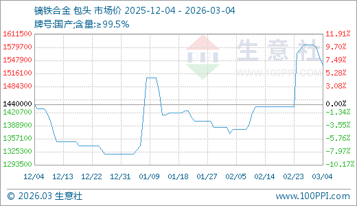 据生意社监测,镝铁合金03月04日最新价格1535000.00万元/吨,最近10天上涨6.97%,30天上涨10.83%,60天上涨16.29%。