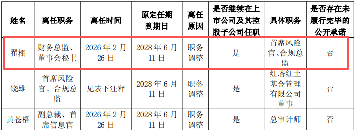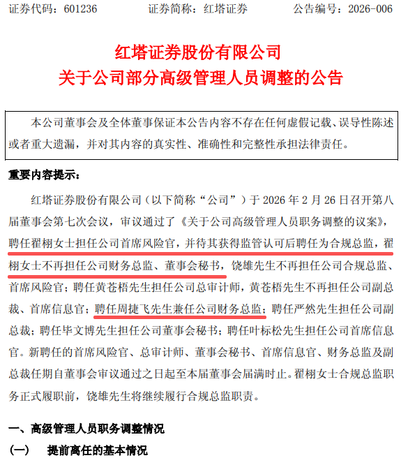 2026年2月28日,上交所主板上市公司红塔证券(601236.SH)发布了《关于公司部分高级管理人员调整的公告》。公告显示,因职务调整,聘任翟栩女士担任公司首席风险官,并待其获得监管认可后聘任为合规总监,翟栩女士不再担任公司财务总监、董事会秘书,聘任周捷飞先生兼任公司财务总监。