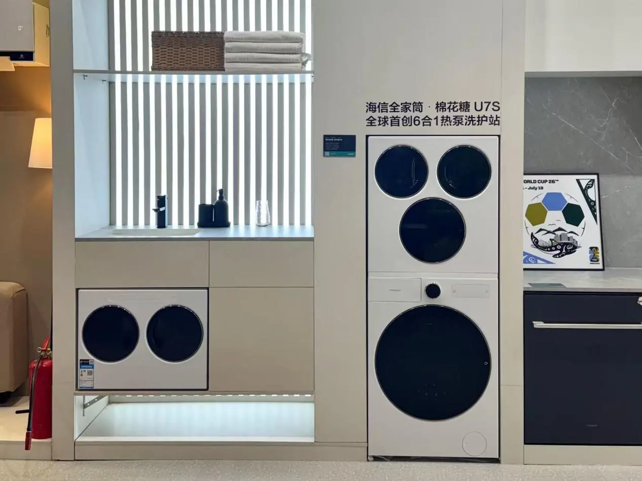继 2017年全球首创三筒洗衣机,到2025年全球首创4合1热泵洗烘一体机,3月5日,在“海信世界杯营销暨定制产品发布会”上,海信洗衣机再次发布颠覆性创新产品:全球首创6合1热泵洗护站——海信全家筒.棉花糖U7S四筒洗衣机,同步为年轻一代用户推出线上爆款新品——海信全家筒.大薄荷E5S四筒洗衣机。新一代全家筒首创集成在洗衣机里的洗鞋机,并跨越升级Ai宙斯热泵3.0技术,烘干效率提升32%,并以“自由组合衣鞋同净”的颠覆性设计,在0.5m的空间内实现全家衣物、鞋子的0手洗|0等待|0交叉,从分类、健康、护理、体验四大维度进行升级,让用户体验到“从上到下、从里到外、从头到脚”全身分区健康洗护躺平式自由。