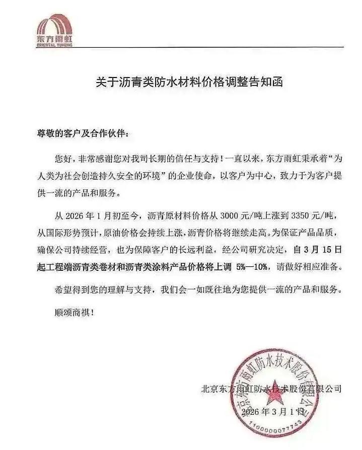 北京东方雨虹防水技术股份有限公司发布了《关于沥青类防水材料价格调整告知函》。从2026年1月初至今,沥青原材料从3000元/吨涨到3350元/吨,涨幅超10%。国际形势预计,原油价格会持续上涨,沥青将继续走高。为保证产品品质和公司持续经营,公司决定自3月15日起,工程端沥青类卷材和涂料产品上调5%-10%。