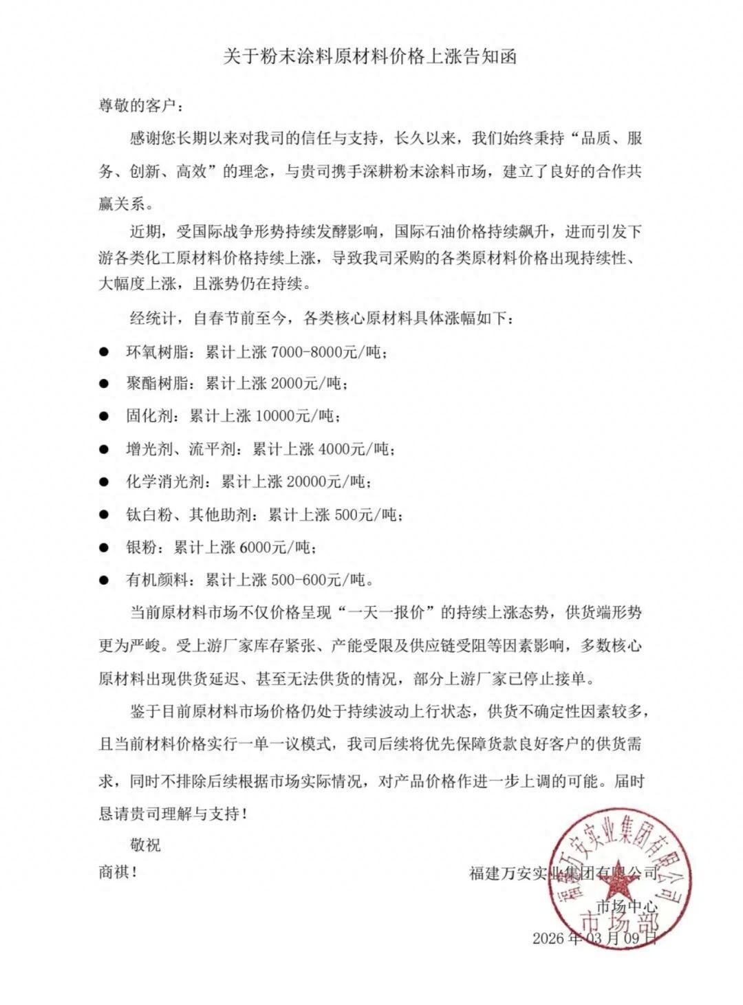 3月9日,福建万安实业集团对外发布《关于粉末涂料原材料价格上涨告知函》,即日起实行一单一议模式。