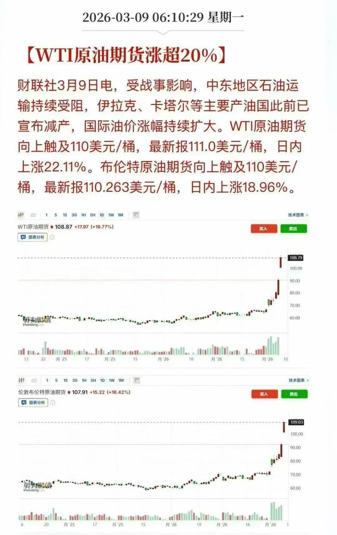 2026年开年,中东战事升级,石油运输受阻,伊拉克、卡塔尔等主要产油国宣布减产。3月9日,WTI原油期货向上触及110美元/桶,最新报111.0美元/桶,日内上涨22.11%。布伦特原油期货也触及110美元/桶,上涨18.96%。