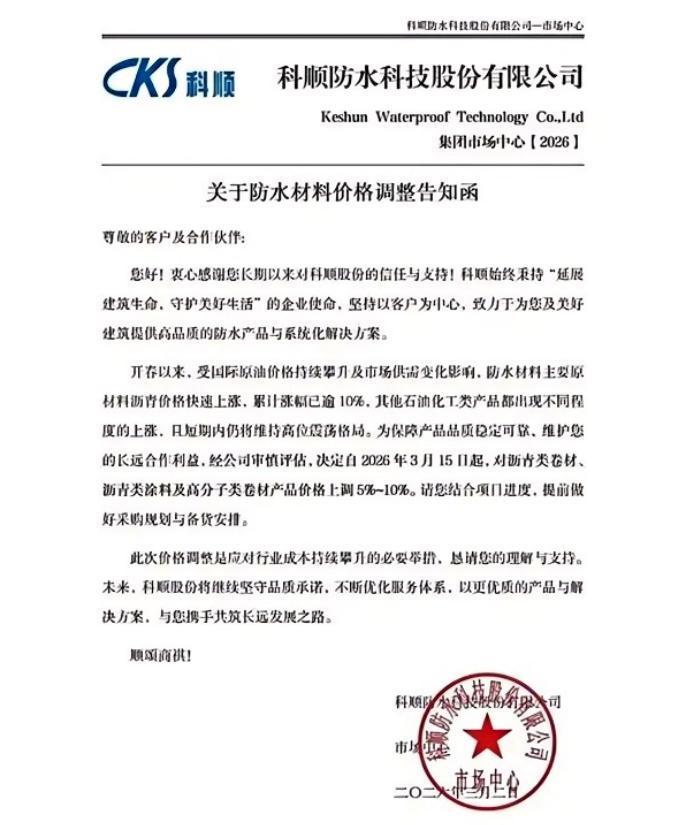 科顺防水科技股份有限公司也跟进。公司自3月15日起,对沥青类卷材、涂料及高分子类卷材上调5%-10%,并提醒客户提前备货。
