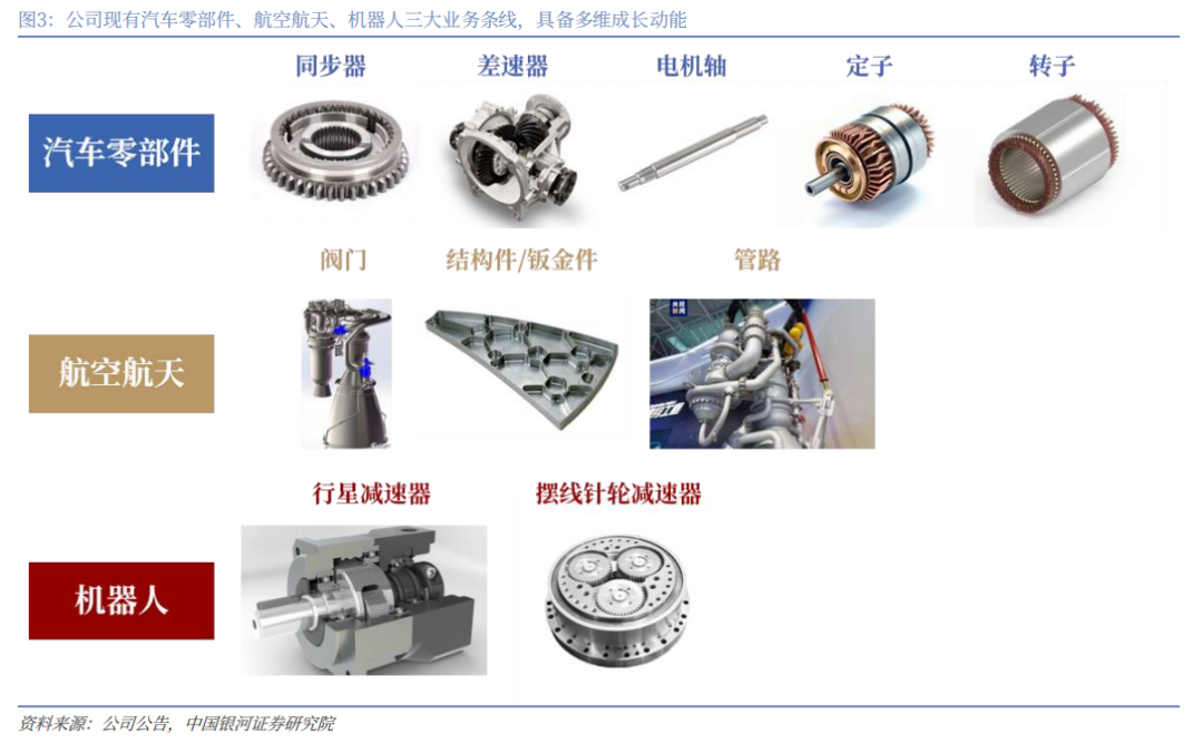 公司现有汽车零部件、航空航天、机器人三大业务条线,具备多维成长动能。汽车零部件业务上,公司布局有同步器、差速器、电机轴、定转子等产品,公司以同步器业务起家,通过拓展差速器、电机轴、定转子等产品有效对冲了燃油车销量下滑带来的同步器产品收入下滑风险,依托我国汽车产业新能源转型趋势延续汽车零部件业务成长动能;航空航天业务上,公司布局有火箭阀门、结构件、钣金件、管路等产品,我国将航空航天作为战略性产业,当前在民机、火箭上存在较大的需求缺口,公司业务前景广阔;机器人业务上,公司基于自身精密制造能力布局行星减速器、摆线针轮减速器等产品,机器人产业长坡厚雪,减速器作为机器人核心部件市场规模扩张潜力十足。