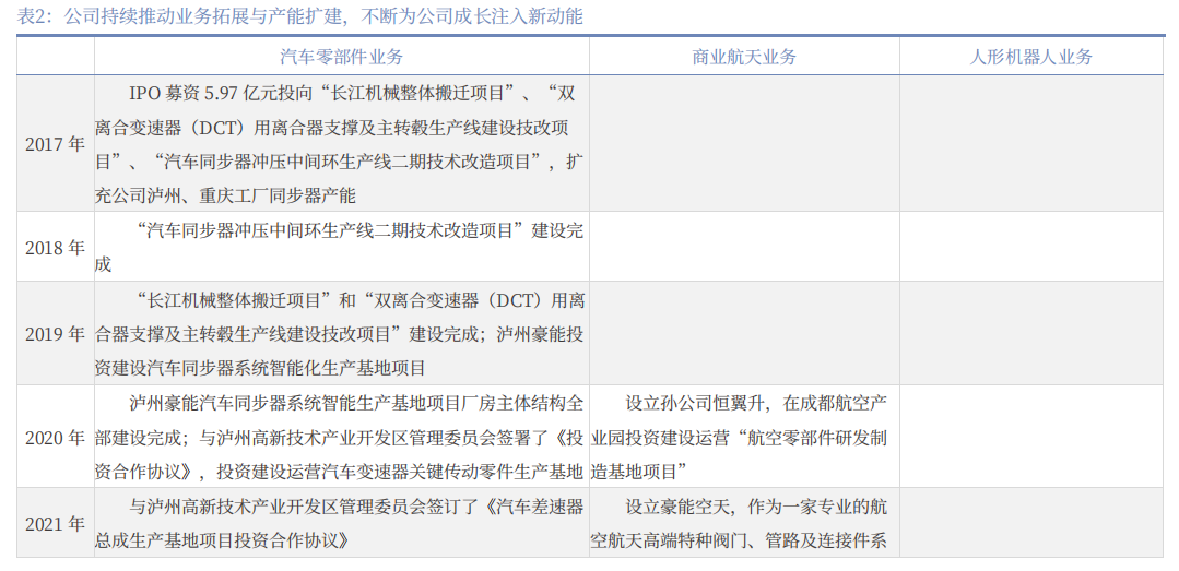 公司拥有六十余年精密制造经验,外延并购与技术内生并举实现业务向广向深拓展。公司成立于2006年,2004-2008年,公司创始人向朝东实现对拥有四十余年发展历史的泸州长江的全资控股,2008年公司吸收合并泸州长江并改制为股份公司,切入汽车同步器领域,并逐步实现从同步环、结合齿向齿毂、齿套等产品的拓展,成长为具备同步器总成生产能力的厂商。2017年上市以来,公司通过外延并购与技术内生并举实现业务向广向深拓展,外延并购方面,2020年-2021年先后完成昊轶强收购与成立豪能空天,切入航空航天零部件制造领域,技术内生方面,基于自身在同步器积累的精密制造技术经验,产品由同步器向差速器、电机轴、定转子、新能源汽车同轴行星减速器等驱动系统部件拓展,并基于产品特性实现向机器人领域行星减速器、摆线减速器等产品的拓展,为公司成长带来多维动能。