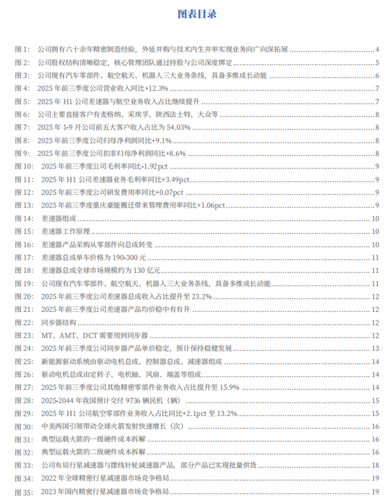 汽车+航空航天+机器人业务布局多元,2025年前三季度业绩稳健增长:公司以同步器业务起家,前身为泸州长江,至今拥有六十余年的精密制造经验,2017年上市以来,公司通过外延并购与技术内生并举实现业务向广向深拓展,汽车业务拓展差速器、电机轴、定转子、减速器等驱动系统部件,并切入航空航天零部件制造与人形机器人零部件制造领域,业务布局多元化。2025年前三季度公司实现营业收入18.95亿元,同比+12.3%,得益于差速器与航空零部件业务的高增,收入保持稳定增长,实现扣非归母净利润2.52亿元,同比+8.6%,稳中有升,受重庆豪能搬迁带来的相关费用较多影响,增速弱于营收。