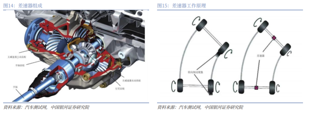 差速器用于解决车辆转弯时的内外侧车轮滑动,是驱动系统必不可少的关键组件。车辆转弯时由于“最小能耗原理”,车轮会自动趋向能耗最低状态,因内外侧轮转弯半径不同产生外侧轮滑脱与内侧轮滑转的现象,差速器将发动机输出扭矩一分为二,允许转向时对左右车轮输出不同转速,保证两侧驱动车轮做纯滚动运动,是车辆驱动系统中必不可少的关键组件。