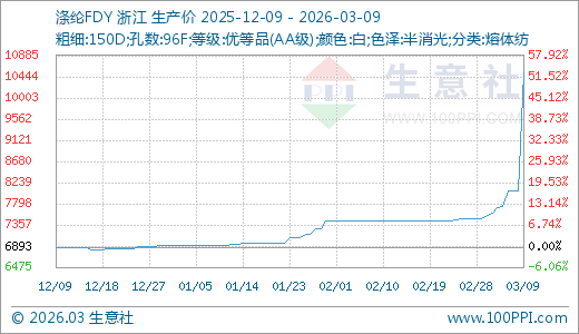 据生意社监测,涤纶FDY03月09日最新价格10518.33元/吨,最近5天上涨36.13%,10天上涨40.49%,15天上涨41.28%,60天上涨51.85%。