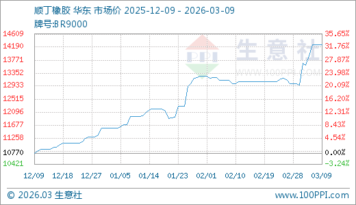 据生意社监测,顺丁橡胶03月09日最新价格14260.00元/吨,最近5天上涨4.78%,10天上涨9.61%,60天上涨19.23%。