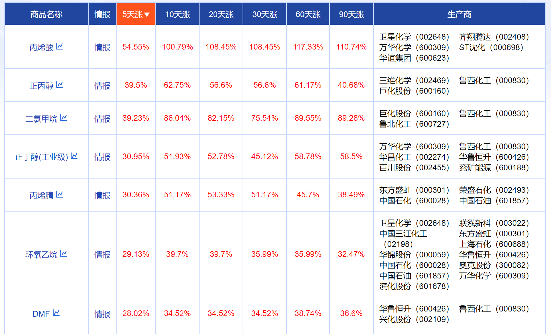 生意社股票通数据显示,近5天化工板块各产品涨幅遥遥领先,其中丙烯酸涨54.55%、正丙醇涨39.5%、二氯甲烷涨39.23%、正丁醇涨30.95%、丙烯腈涨30.36%。同时带动相关上市公司走强,3月11日金牛化工、中盐化工、金浦钛业、百川股份等多股涨停。