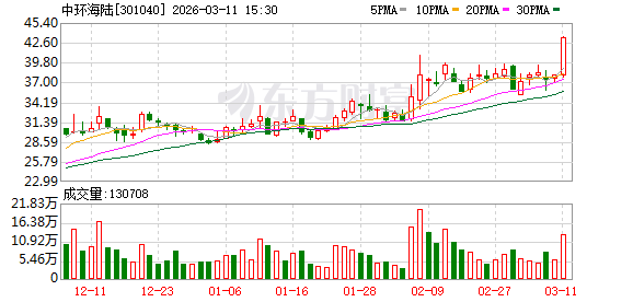 证券时报·数据宝统计显示,中环海陆今日收盘价为43.25元,上涨13.76%,日换手率为13.87%,成交额为5.30亿元,全天主力资金净流入311.06万元,近5日该股累计上涨16.33%,近5日资金合计净流出2171.77万元。