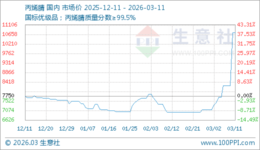 据生意社监测,丙烯腈03月11日最新价格10733.33元/吨,最近5天上涨30.36%,10天上涨51.17%,20天上涨53.33%。