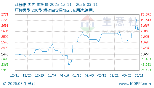据生意社监测,菜籽粕03月11日最新价格2670.00元/吨,最近10天上涨4.62%,60天上涨7.66%,90天上涨9.20%。
