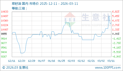 据生意社监测,菜籽油03月11日最新价格10310.00元/吨,最近20天上涨5.42%,10天上涨4.31%。