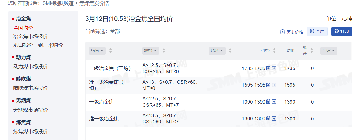现货市场方面:3月12日,临汾低硫主焦煤报价1450元/吨。唐山低硫主焦煤报价1460元/吨。一级冶金焦-干熄全国均价为1735元/吨。准一级冶金焦-干熄全国均价为1595元/吨。一级冶金焦-湿熄全国均价为1390元/吨。准一级冶金焦-湿熄全国均价为1300元/吨。