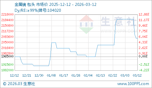 据生意社监测,金属镝03月12日最新价格2075000.00元/吨,最近30天上涨3.49%,90天上涨5.60%。