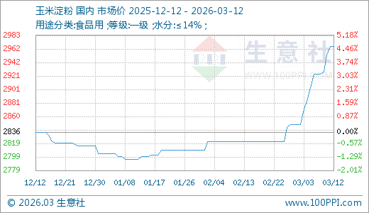 据生意社监测,玉米淀粉03月12日最新价格2966.00元/吨,最近10天上涨4.14%,20天上涨5.10%,60天上涨6.08%。
