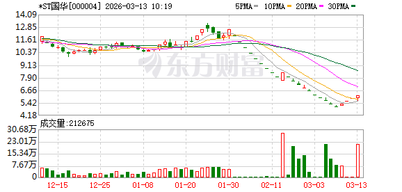 *ST国华盘中涨停,已连收4个涨停板,截至9:41,该股报6.16元,换手率12.45%,成交量1571.93万股,成交金额9305.33万元,涨停板封单金额为213.07万元。连续涨停期间,该股累计上涨21.50%,累计换手率为19.75%。最新A股总市值达8.15亿元,A股流通市值7.78亿元。
