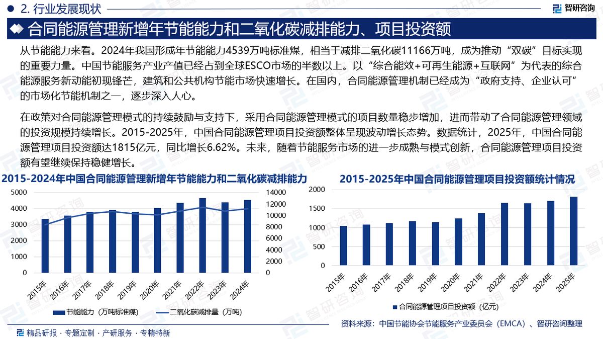 合同能源管理简称“EMC”,是一种新型的市场化节能机制。它是由专业能源服务公司通过对客户能源的全部或某些方面的使用情况进行检测、诊断和分析,找出客户能源使用中存在的缺陷和问题,提出经济适用的改进或改造方案,并经客户同意后组织实施节能改造方案,从而系统优化、节能降耗、节省能源开支的目的。从节能能力来看。2024年我国形成年节能能力4539万吨标准煤,相当于减排二氧化碳11166万吨,成为推动“双碳”目标实现的重要力量。中国节能服务产业产值已经占到全球ESCO市场的半数以上。以“综合能效+可再生能源+互联网”为代表的综合能源服务新动能初现锋芒,建筑和公共机构节能市场快速增长。在国内,合同能源管理机制已经成为“政府支持、企业认可”的市场化节能机制之一,逐步深入人心。与传统的能源管理和节能改造模式相对比,合同能源管理是一种市场机制,除了项目的节能减排的社会效益,其运行关键是项目将给合同的双方带来的经济效益。随着中国节能服务产业的不断发展,节能服务公司签约项目合同类型逐渐丰富,商业模式包括节能效益分享型、节能量保证型、能源费用托管型合同能源管理以及BT/BOO/BOT、工程总承包/节能工程、设备购销、技术咨询/技术服务、融资租赁等其他商业模式。在政策对合同能源管理模式的持续鼓励与支持下,采用合同能源管理模式的项目数量稳步增加,进而带动了合同能源管理领域的投资规模持续增长。2015-2025年,中国合同能源管理项目投资额整体呈现波动增长态势。数据统计,2025年,中国合同能源管理项目投资额达1815亿元,同比增长6.62%。未来,随着节能服务市场的进一步成熟与模式创新,合同能源管理项目投资额有望继续保持稳健增长。我国节能服务产业从业主体整体呈现多而分散,产业集中度不高态势。2020年以来,行业整合加速,产业出现资源向头部企业汇集的苗头,竞争格局逐步分化。整体来看,目前,我国合同能源管理领域缺乏国际影响力,国际市场占有率不高;国内领先企业及区域领先企业获取资源的能力逐步增强,技术整合速度加快。合同能源管理市场竞争中,国内综合性节能服务公司主要依靠资本规模、较高的产能装置、先进的节能技术等优势迅速抢占市场,如中节能环保集团、双良节能(维权)、清新环境等;区域领先企业尽管经营规模相对较小,但依靠其细分市场技术门槛、高品质和差异化服务,仍在激烈的市场竞争中占据一席之地,如仟亿达、南网能源等;发展性企业和起步型企业数量众多,市场竞争较为激烈,随着资源不断向头部企业集中,部分实力不强、技术落后的企业获取EMC项目难度将日益加大。