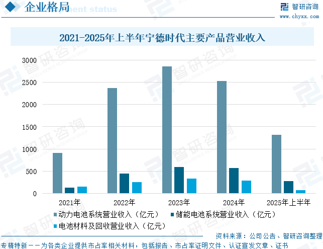 宁德时代新能源科技股份有限公司主要从事动力电池、储能电池和电池回收利用产品的研发、生产和销售。锂电池是全球绿色低碳与清洁能源转型的关键部件。研发并大规模生产兼具高安全、高性能、高质量、低成本等特性的锂电池门槛极高,不仅要求公司对电化学、热力学、分子动力学等多学科及覆盖微观、介观、宏观多尺度的基础理论有深刻的理解和综合应用能力,还要求公司具备强大的工艺设计、工程制造和质量管控的能力。公司的团队深耕锂电行业多年,基于对分子动力学、电化学相场法、相图理论等研究方法和科学理论的理解,依托自身在锂电池行业的丰富经验与技术沉淀,形成了基于第一性原理的独特研发创新体系。截至报告期末,公司拥有六大研发中心,研发人员超过2.1万名。公司将安全、质量、成本贯穿全流程管理,自主研发了高通量材料集成计算、智能化电芯设计、智能化工艺设计等高效研发平台,并基于海量、多场景的客户及终端用户需求反哺研发设计,针对性地提升产品性能,优化产品方案,形成正向良性循环,打造全方位的研发优势。从企业经营情况来看,2025年上半年,宁德时代动力电池系统营业收入为1316亿元,同比增长16.87%;储能电池系统营业收入为284亿元,同比下降1.47%;电池材料及回收营业收入为78.87亿元,同比下降44.97%。