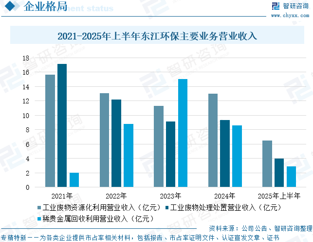 东江环保股份有限公司持续深耕工业和市政废物的资源化利用与无害化处理、稀贵金属回收利用业务,并配套开展水治理、环境工程、环境检测等业务,以成为“中国优秀的综合环境服务商”和“中国资源循环产业领军企业”为目标不断奋进。在工业危险废物资源化利用与无害化处置业务中,公司深耕工业危险废物业务二十余年,危险废物经营资质总量、种类、处理能力位居行业前列,在不断强化危废资源化综合利用和无害化处置业务的基础上,通过不同技术路线的组合对复杂多样的危险废物进行无害化处理、资源化利用及最终处置,使不同类别的危险废物得到安全处理与处置,消除危险废物对环境的污染隐患。在稀贵金属回收利用业务中,公司已形成对含有色金属废料、废渣等废弃资源及其他物料回收再利用的成熟生产工艺,可综合利用的有色金属物料包括锌冶炼、铅冶炼、铜冶炼、钢铁冶炼企业及其它有色金属回收行业二次资源,所属企业雄风环保年可处理废物达6.64万吨,年综合回收各种金属近2万吨。在生态环境服务业务中,公司聚焦城乡环境综合治理需求,提供涵盖市政污水处理、生活垃圾处理、工业园区环境综合治理、环境检测与咨询等多元化服务,具备提供定制化解决方案及一站式环保管家服务能力,并通过数字化技术搭建环境治理智慧化平台,强化降碳减污协同能力,致力于为政府、园区及企业提供全生命周期环境管理服务。在智慧环保、信息化建设业务中,公司引入5G、AI、大数据、数字孪生等新兴技术,延伸出危废处置企业生产和管理的多个智能化场景,打造运营数字化、生产智能化的现代化危废智能化工厂,实现生产智能化。公司自主研发了以“智慧环保运营”、“智慧安环管理”、“危废智能化工厂”、“有容一体化融合平台”四大方案为核心的智慧环保整体解决方案,相关成果获多项国家级、省级荣誉。从企业经营情况来看,2025年上半年,东江环保工业废物资源化利用营业收入为6.46亿元,同比增长14.54%;工业废物处理处置营业收入为3.97亿元,同比下降1.24%;稀贵金属回收利用营业收入为2.87亿元,同比下降27.71%。