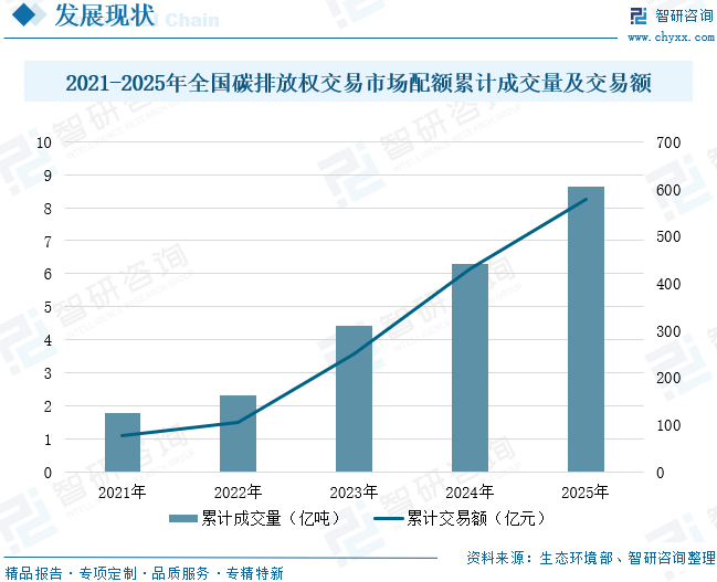 碳交易市场是构建低碳经济的关键一环,也是全球解决气候变化问题的有效手段。碳交易市场主要由全国碳排放权交易市场(强制碳市场)和全国温室气体自愿减排交易市场(自愿碳市场)组成。其中,全国碳排放权交易市场是中国为实现碳达峰与碳中和目标建立的核心政策工具,通过市场化机制控制温室气体排放。而配额是碳排放权交易体系中的基本单位,指政府通过免费分配或拍卖方式发放的、允许企业在特定时期内排放的二氧化碳当量。近年来,全国碳市场活力稳步提升。全国碳市场重点排放单位碳减排意识持续加强,配额清缴完成情况保持在高水平,全国温室气体自愿减排交易市场支持领域进一步扩大,市场迎来快速扩容。全国碳市场推动全社会实现低成本减排功能不断显现。数据显示,截至2025年12月31日,全国碳排放权交易市场配额累计成交量8.65亿吨,累计成交额576.63亿元。其中,2025年全年配额成交量2.35亿吨,同比增长约24%,成交额146.3亿元,交易规模持续扩大。交易价格保持在合理区间,年底收盘价为74.63元/吨,全年交易均价为62.36元/吨。组织完成8场单向竞价,满足市场多样化交易需求。