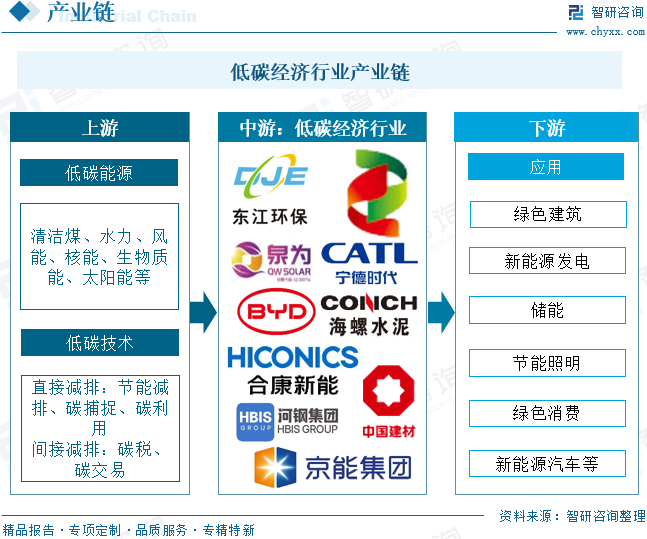 低碳经济产业链上游为低碳能源供应和低碳技术研发,其中,低碳能源包括清洁煤、水力、风能、核能、生物质能、太阳能等;低碳技术包括直接减排和间接减排。产业链中游为低碳经济企业。产业链下游为最终应用与消费环节,致力于将低碳经济理念融入经济社会发展的终端,全面推动生产生活方式的绿色变革。主要包括绿色建筑、新能源发电、储能、节能照明、绿色消费、新能源汽车等。