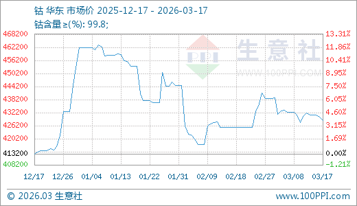 据生意社监测,钴03月17日最新价格428700.00元/吨,最近90天上涨3.75%。