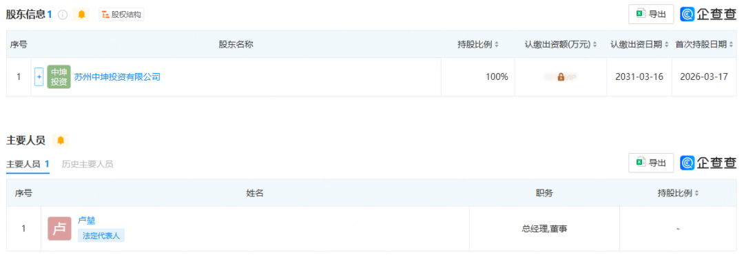 大连海运有限公司当日已完成注册登记。企查查页面显示,大连海运有限公司成立于2026年3月17日,法定代表人卢堃,公司位于辽宁省大连市中山区,由苏州中坤投资有限公司100%持股。
