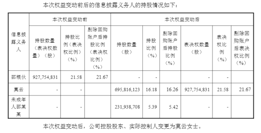 公告显示,莫云作为未成年女儿邵某某的法定监护人,代为行使女儿所持股份的相关权利。由此,莫云合计持有公司表决权9.28亿股,占公司有表决权股份总数的比例为21.58%,足以对公司股东会决议产生重大影响。本次权益变动后,公司控股股东、实际控制人变更为莫云。