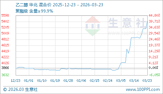 据生意社监测,乙二醇03月23日最新价格5435.00元/吨,最近5天上涨11.79%,20天上涨41.97%,60天上涨43.15%。