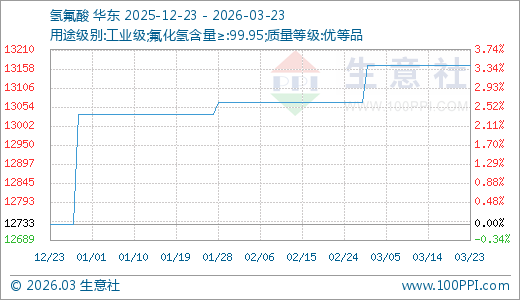 氢氟酸03月23日最新价格13166.67元/吨,最近90天上涨3.40%。