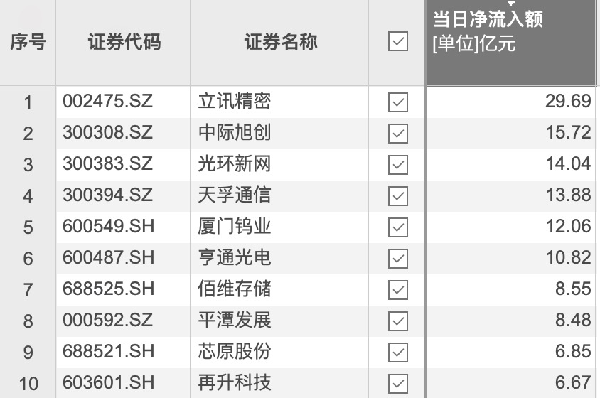 上证报中国证券网讯(记者 李雨琪)Choice数据显示,3月25日,资金净流入额排名前十的个股依次是立讯精密、中际旭创、光环新网、天孚通信、厦门钨业、亨通光电、佰维存储、平潭发展、芯原股份、再升科技。其中,立讯精密获净流入29.69亿元。