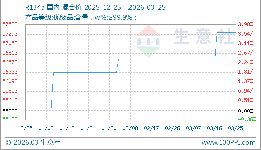 R134a03月25日最新价格57333.33元/吨,最近90天上涨3.61%。