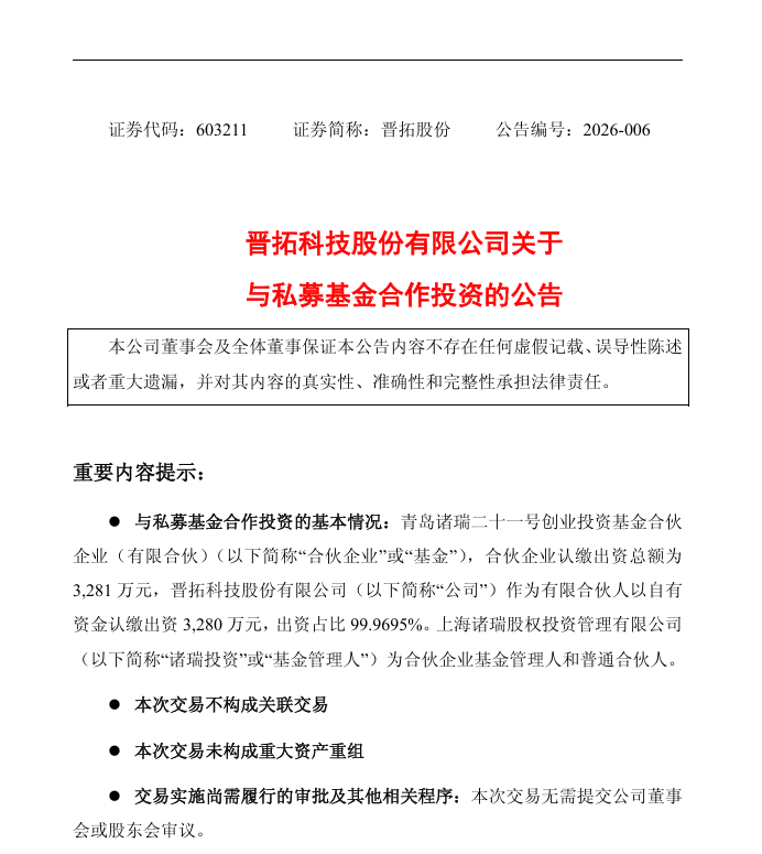 早在2025年12月,双方就已共同设立安义诸瑞晋拓创业投资合伙企业(有限合伙),基金规模3181万元。与诸瑞二十一号基金类似,晋拓股份同样出资占比99.97%,诸瑞投资出资占比0.03%。