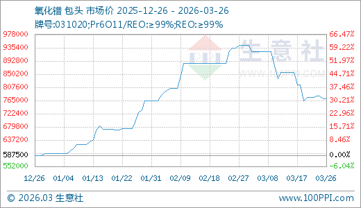氧化镨03月26日最新价格770000.00万元/吨,最近60天上涨14.07%,90天上涨31.06%。