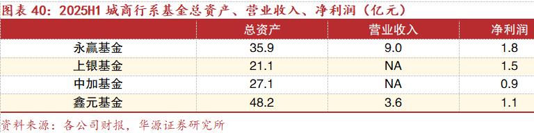 永赢基金在城商行系基金中业绩与资产规模均属前列:2025H1末永赢基金总资产35.9亿元,仅次于鑫元基金(48.2亿元),显著高于中加基金(27.1亿元)与上银基金(21.1亿元);业绩端,1H25永赢基金实现营业收入9.0亿元、净利润1.8亿元,在城商行系基金中净利润处于领先水平(高于上银基金1.52亿元、鑫元基金1.07亿元、中加基金0.94亿元)。管理规模上,2025H1末永赢基金管理规模为5447亿元,较年初增加2.9%。