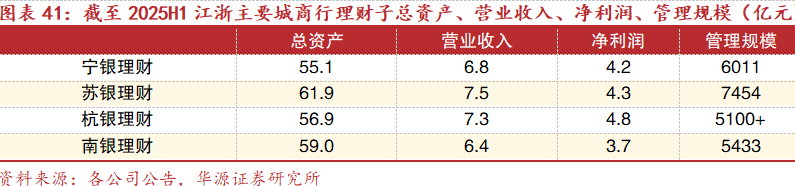 宁银理财在江浙城商行理财子中处于第一梯队,规模与盈利能力均具备较强竞争力。规模端看,2025H1末宁银理财管理规模达6000亿元以上,与苏银理财(7454亿元)同属头部梯队,显著高于杭银理财(5100亿元以上)与南银理财(5433亿元)。业绩端看,1H25宁银理财实现净利润4.2亿元,与苏银理财(4.3亿元)基本持平,略低于杭银理财(4.8亿元),但明显高于南银理财(3.7亿元)。