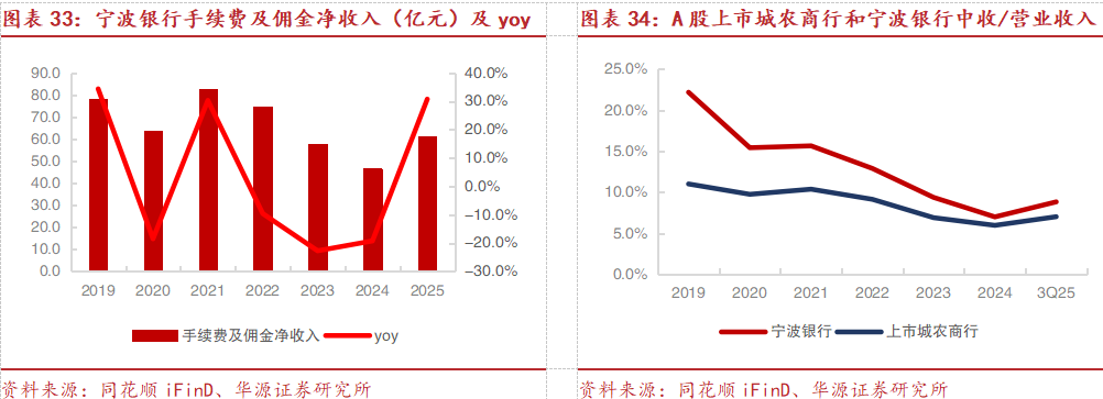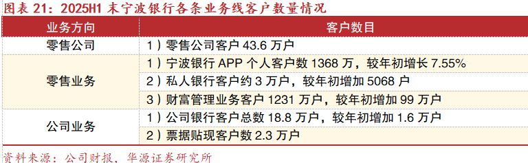 多元化利润结构筑护城河。根据业绩快报,2025年宁波银行手续费及佣金净收入60.9亿元,同比+30.7%。宁波银行零售AUM保持稳健扩张,2025年末零售客户AUM规模达1.28万亿元。公司拥有永赢基金、宁银消金、宁银理财等子公司,2025H1末宁银消金总资产约701亿元,较年初增长17.2%,资产规模位于消金公司前列,1H25宁银消金实现净利润2.5亿元;1H25永赢基金实现净利润1.8亿元。2025H1末宁银理财管理规模达6000亿元以上,1H25实现净利润4.2亿元。