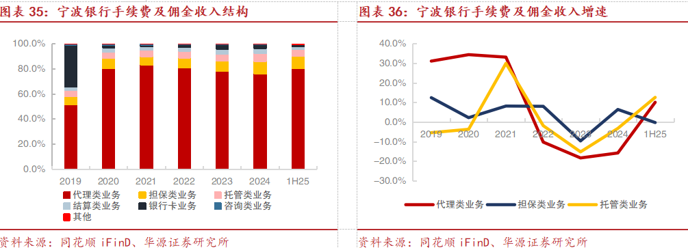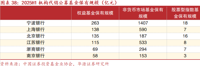 2025年上半年宁波银行在公募基金保有规模中处于城商行领先位置。2025H1末宁波银行权益类基金保有规模约263亿元,非货币市场基金保有规模约1407亿元,股票型指数基金保有规模约18亿元。对比看,上海银行权益/非货币市场/股票型指数基金分别为138/590/7亿元;北京银行为135/187/16亿元;江苏银行为115/533/8亿元。宁波银行在权益与非货基两项上优势更为突出。若权益市场活跃度持续上行,有望对宁波银行基金代销与财富管理相关手续费收入构成更直接的增长支撑。