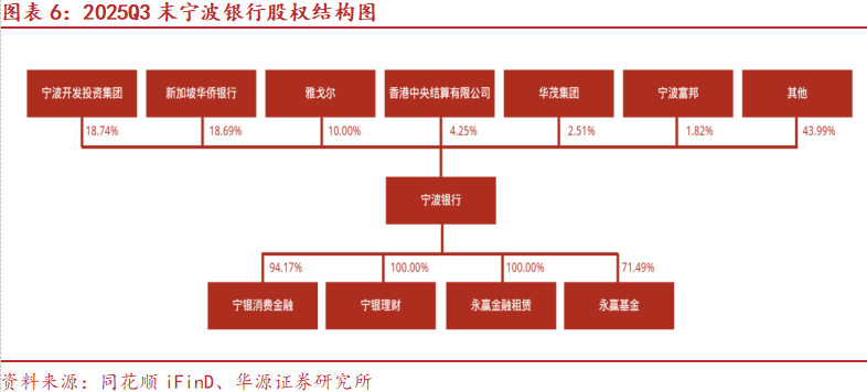 股权结构三足鼎立,公司治理市场化。宁波银行的股权结构呈现出国有资本、外资与民营资本三足鼎立、相互制衡的格局,为公司建立起高度市场化、规范化的公司治理体系。截至2025Q3末,公司前十大股东中,宁波市国资系统合计控股21.22%,宁波开发投资集团(为第一大股东)、宁兴资产管理公司及宁波市轨道交通集团等;外资合计控股比例达到20.02%,核心为2006年公司引入的新加坡华侨银行(OCBC),其不仅通过直接持股,还通过QFII账户持有股份,体现其长期战略参与者定位;民营资本合计持股14.33%,主要来自宁波本地的知名民企,如雅戈尔、宁波富邦、华茂集团等。宁波银行的控股子公司有宁银消金(94.17%)、宁银理财(100%)、永赢金租(100%)、永赢基金(71.49%)。