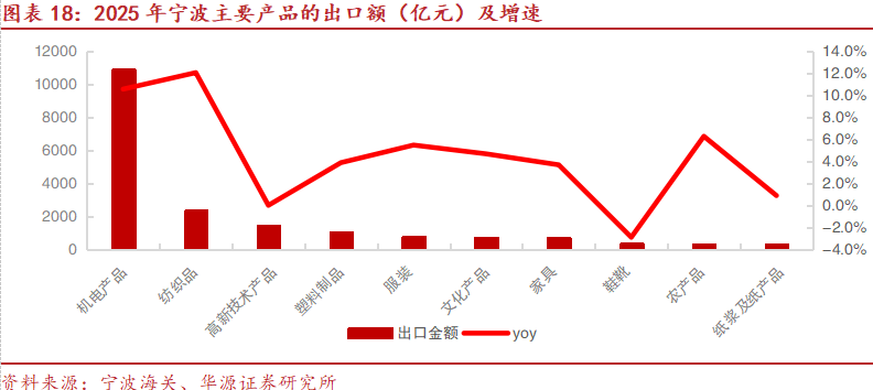 从出口产品结构看,宁波制造业底盘深厚。2025年宁波机电产品出口额1.1万亿元,同比+10.6%,是出口增长的第一驱动力;纺织品出口2367亿元,同比+12.1%,为第二大支撑。其次出口产品涵盖高新技术产品、塑料制品、家具、服装等。整体来看,宁波出口以高附加值、产业链完备的机电产品为主,叠加传统优势品类,产品结构质量较优。
