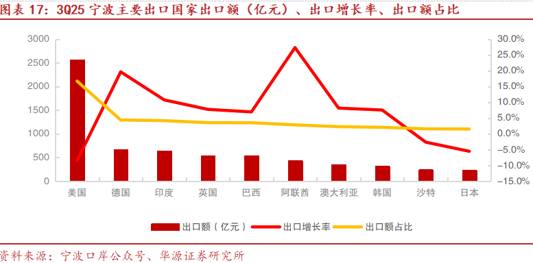 新兴市场占比持续提升,出口结构优化。3Q25宁波对美国出口额约2564亿元,占比16.7%,但增速为-8.5%,显示外部关税政策变动下对美出口阶段性承压;欧洲方向出现改善,其中对德国出口668亿元,同比+19.6%,对英国出口537亿元,同比+7.7%。与此同时,新兴经济体对出口的拉动更为突出,宁波对印度出口635亿元(+10.7%)、对巴西出口532亿元(+6.9%)、对阿联酋出口429亿元(+27.3%)。整体看,3Q25宁波出口合计约1.54万亿元,同比+10.0%,结构上由欧洲回暖与新兴市场扩张共同支撑。