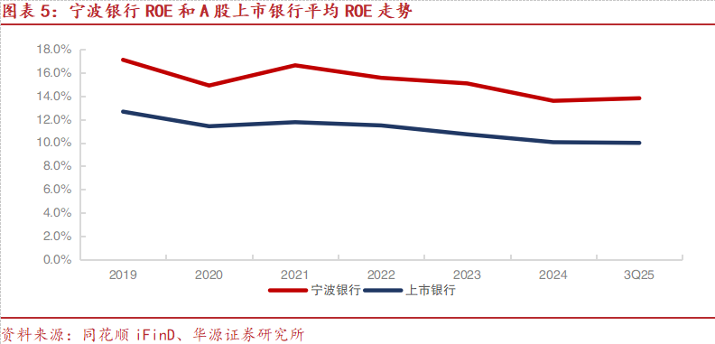 我们认为宁波银行ROE的核心支撑因素主要来自三方面。一是以中小企业客户+消费贷为主的贷款投放带来更高的贷款收益率,叠加活期沉淀能力较强、负债成本相对更优,形成较充足的息差空间;二是财富管理、结算等轻资本中收业务基础扎实,为盈利提供多元来源;三是风控能力与资产质量长期保持优于同业,风险成本相对可控。