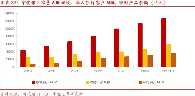 零售财富管理方面,宁波银行零售AUM保持稳健扩张。2019-2024年末零售客户AUM由4378亿元提升至1.13万亿元,5年复合增速约20.8%;根据业绩快报,2025年末进一步增至1.28万亿元,同比约13.1%,体现客户资金沉淀与财富管理承接能力持续增强。私行方面上,私行客户AUM由2019年的671亿元提升至2024年的3036亿元,2025H1进一步至3585亿元,2025年末宁波银行约有2.9万私行客户,高净值客群经营成效持续兑现。理财产品余额方面,2020年末宁波银行规模同比小幅回落,后进入上行通道,2024年末增至4735亿元,2025H1末升至6011亿元。