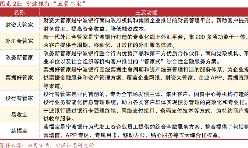 “五管二宝”体系全面覆盖企业需求,对公服务能力显著提升。宁波银行通过构建“五管二宝”对公产品体系,充分发挥渠道与数据优势,持续提升综合金融服务能力,为存款规模扩张与低成本资金沉淀奠定了基础。该体系包括“财资大管家、外汇金管家、投行智管家、票据好管家、政务新管家”五大核心产品,以及“易收宝”和“薪福宝”两大综合服务方案,覆盖不同类型企业的多元业务场景,实现对公业务的全链条服务。