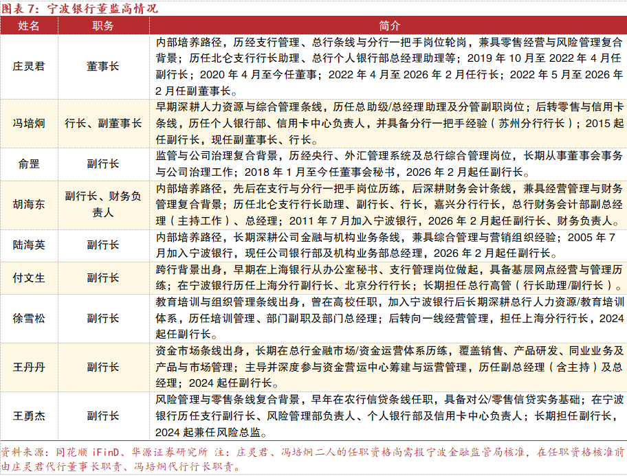 2026年2月公司完成董监高换届,自2005年任董事长的陆华裕交棒庄灵君,我们认为宁波银行换届后战略依旧会保持稳定。 董事长庄灵君属于典型内部培养的管理者,历经支行管理、分行行长及总行条线岗位,兼具零售经营与风险管理经验。行长冯培炯则长期深耕零售、信用卡及综合管理条线。其他副行长则主要围绕关键能力补位,覆盖公司治理、财务管理、公司金融、资金运营等。