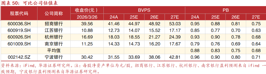 我们采用同业比较法对宁波银行进行估值,采用招商银行、江苏银行、杭州银行、南京银行作为宁波银行的可比银行,截至2026年3月26日,4家可比公司26年P/B区间为0.69-0.81倍,平均0.75倍。