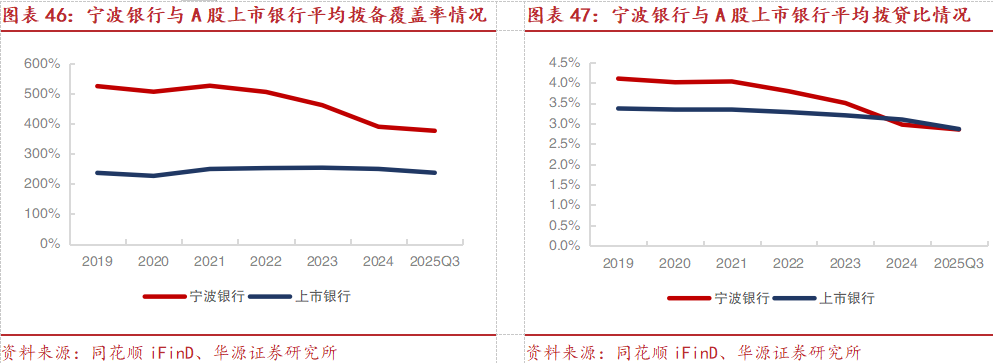 宁波银行拨贷比整体处于较高水平。2019-2023年末公司拨贷比由4.1%降至3.5%,2024年末进一步降至3.0%,2025Q3末为2.9%。对比来看,2019年末至2023年末公司拨贷比高于A股上市银行的均值;2025Q3末公司拨贷比与行业均值基本持平。